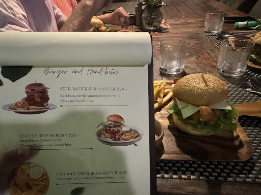 Мы заказали бургер 🍔 с рыбой, когда нам его принесли я с трудом его съел. Картошка 🥔 вчерашняя подогретая, хлеб сухой, рыба в кляре (очень дешевая) есть эти помои было не возможно но я был очень голодный по этому съел только рыбу .