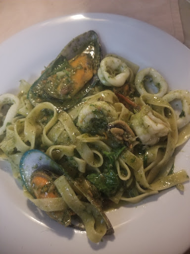We had a salad which was good size serving with great creamy dressing,. Vegetarian pizza was baked to perfection with plenty off veggies. The seafood pesto fettuccini dqually delicous in flavor with your standard 2 mussels, 2 shrimp and a few squid rings.