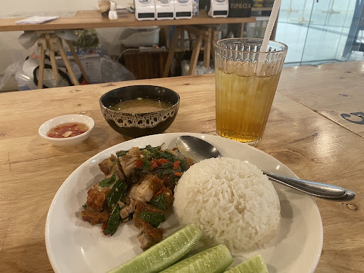 The fried rice is fragrant and not overly oily though the rice is not “beany” form. The crispy pork belly is so crunchy (I could hear it in my mouth while chewing it 😄) and juicy, and goes very well with the sliced chilli and fish sauce. A cold tea drink is served free for consumers. Well, the price to pay,...