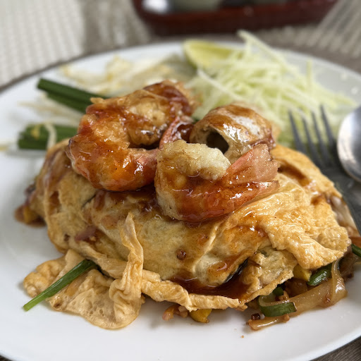 I think the prawns are fried separately in some tamarind paste. I love it! The noodles were of a slightly wetter style of cooking than many other places. Lots of taufu bits mixed with the Pad Thai, which you see once you unwrapped the egg “crepe” cover.