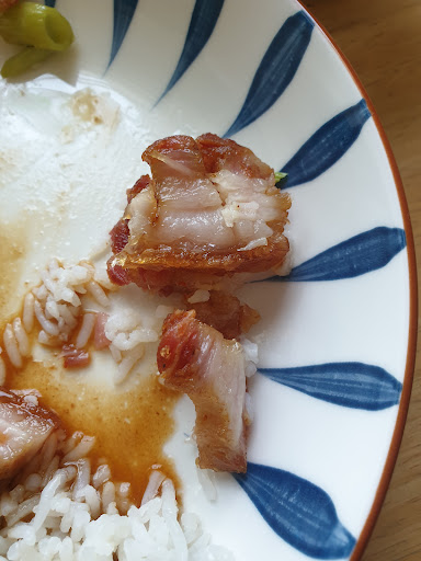 ●คหสต.แต่ละเมนู ข้าวหมูกรอบ - ไม่มีความกรอบเลยครับ หนังมีแต่ความเหนียวและแข็งมาก เคี้ยวไม่ลง ซึ่งผมเห็นตั้งแต่ตอนพนักงานใช้มีดหั่นแล้วครับ เพราะหั่นไม่ขาด! / รสชาติส่วนเนื้อก็แห้งๆ ชืดๆครับ ข้าวหน้าเป็ด - ปกติทั่วไป แต่หนังเป็ดลอกขนไม่ดี ต้องมาเขี่ยทิ้งครับ และมีหนังไหม้สีดำเลยครับ น้ำราดเป็ดและหมูกรอบ - รสชาติโอเค แต่ผมว่าน้ำมันเยอะไปหน่อยครับ ลอยหน้าเลย ดูจากรูปได้ครับ / ร้านนี้ใช้ผักเป็นผักบุ้งลวกครับ