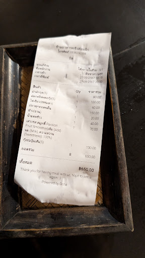 Extensive menu, prompt & warm service, reasonable prices (menu attached in pics). Be prepared to wait (45 minutes) if there are other tables not served. I liked the ferns with squid and coconut, the crispy omelette and the glass noodles with big prawns. Catfish with turmeric was crispy and tasty, although I would probably get something else next time (because of the hard exrerior). Sambal petai is the dark, watery sort, so I would skip this if you're used to the red minced chilli style. Smoothies were great and coconut was fragrant. Would revisit for the smoothies and happily try more stuff on the menu. Note- WISE payment incurs an extra 40 baht fee (on a bill of 650 baht).