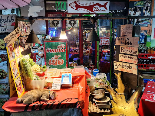 Read moreFirst night in Bangkok, we are searching for authentic food. Google leads us to this tiny place directly next to a bend in the street near our hotel. Only 4 tables inside, the cooking happens in front of the house. Cats outside and inside, that seem to guard the place sleeping. Insight an overwhelming mix of plastic memorabilia, mirrors, art and photographs, that serve as the surrounding story to tell people once back at home. We are unsure, what to order. In the end we get a Sprite, Coke, and two main dishes. We don’t know if we need to order rice as a side or if this is even usual in Bangkok, we do not, and FYI is unsurprisingly not included. Him and her, running the place seem an effective couple. Very friendly and very efficient. Shortly after, the food arrives. Only one word: