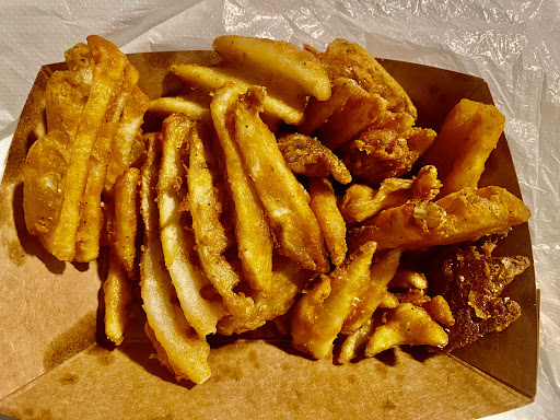 My food came out first admit wasn't too bad. Chicken was a little dry and could have used more sauce. The brown rice was... brown rice. The salad was just cut romaine lettuce with an oriental/thousand island dressing. A few minutes later my wife's sandwich came out. Man it looked so good! Right as my wife was about to eat one of the waffle fries, she stopped. "That's a hair on my fry...". I pulled the plate closer to me, lo and behold there was a 2" hair with white follicle staring at me on top of one of the waffle fries. SMH...