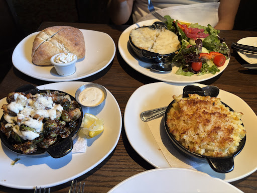 Read moreVast steakhouse on Granville Island. Front area with bar is quite bright and noisy, inner sanctum past the kitchen is more dark, intimate, classic steakhouse, with a few windows at the booths near the sidewalk that allow the sun to enter. Thereâs also a stairway going upstairs, but I didnât investigate whether that dining room is used. Lots of staff and a very warm welcome. They have a dispenser of flavoured water at the entryway for parched visitors, unlike Joey, which usually presents a flute of sparkling wine. Happy hour provides discounted prices on libations up until 6 PM on weekdays, and I had a lovely glass of sparkling rosĂ© as we had come to dine at 5:30 before heading to a Fringe show. Since weâre vegetarians, we ordered the brussels sprouts without the bacon. They had a nice char from the roasting, but were a bit dry without the fatty bacon. There are a few small croutons mixed in, and a grating of cheese on top. The Caesar dip served on the side was delicious. The complimentary loaf of sourdough with the cheese butter is spectacular. The main of vegetarian shepherds pie was a nice option, served with a healthy portion of mixed salad topped with pickled onions in a light vinaigrette. The shepherds pie itself was served in one of the black porcelain ramekins that the brussels sprouts and the mac & cheese were served in. It looks like itâs a cast-iron mini skillet, but probably much easier to run through a commercial dishwasher. The flavours were very good, and my partner who is not a big fan of mushrooms, was grateful that there were big pieces, only the flavor. The lentils and vegetables Quite small with very little texture, and only came about halfway up the inch ramekin. The mashed potatoes on top were light and fluffy. I might have expected that they would have been piped in rosetteâs on top. It was nice to see something other than a vegetable pasta, or a grilled portobello mushroom cap for a change. The side of mac & cheese was ample, talked with beautifully crisp Panko breadcrumbs. However, it was bland with very little cheese flavor. There was certainly no stringy, mozzarella or shreds of cheddar visible. On a future visit, I would probably order the cauliflower with hot sauce on the side, and a wedge salad with blue cheese and skip the bacon. Our server was Ally, and she did an excellent job of taking care of us, along with the team who delivered each of our courses and work together beautifully. Bathrooms are clean and well stocked, although finding them in this maze is the reason why they point them out as youâre going to your table. I would have rated 4 1/2 stars instead of five because the value was good. However, the comprehensive dining experience was certainly above a four. The polyester fabric napkins, and the cutlery is of a very high grade, and the salt and pepper grinders on the table a nice touch. All in all, a great pre-theater experience, Iâd like to come and dine again and save some room for...