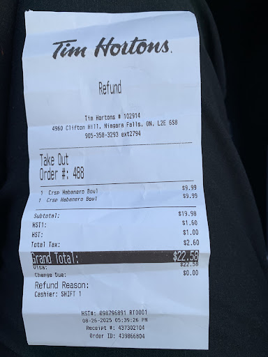 Read moreMid-afternoon Jan 22. I was taking my friend from Senegal here for her first time in Niagara Falls. It is a legendary place to visit for many folks worldwide, she was dreaming of this for decades and we were in town celebrating her 40th bday. She ordered two espressos, and a water. She speaks in an accent, as I assume many folks do, this being a location on Clifton Hill, an international tourist destination. Instead, she was presented with two black coffees with shots of espresso inside of them. I told the staff, "she ordered two espressos". The EXTREMELY RUDE human who has absolutely no business being in a customer service role immediately rolled her eyes, and instead of exhibiting any shred of humanity, empathy or basic respect or decency; just quipped back "I ONLY follow what I see on the screen". Then I responded "well, she meant to order two espressos". Then she slapped back, again extremely rude "well she didn't say that, and I can't take the shots of espresso out of the coffees OBVIOUSLY". I responded "well we don't want these, there was a misunderstanding, can we just exchange these for the correct order?" to which she responded "this is what you ordered, you have to pay if you want something else. So I spoke to the person taking the orders hoping for a real human, and got the same extremely disrespectful treatment and similarly robotic answer "THAT'S WHAT SHE ORDERED". I tried to stop my friend from paying for a new order, but they made her pay, and she did so because she is an actual kind person, was embarrassed of her accent (which most anglophones can understand if they exercise an iota of patience), completely dumbfounded and saddened by the attitude of the absurdly mean staff, and she wanted to treat me to a Tim Horton's "espresso". Over-the-top rudeness unlike anything I've ever encountered anywhere, let alone in any Tim Horton's where folks are typically very kind. This was the absolute worst. Those staff members should not work in public-facing roles at all. Actual robots would have more compassion and humanity. It wasn't even busy at all. There was no one in line when we received our...
