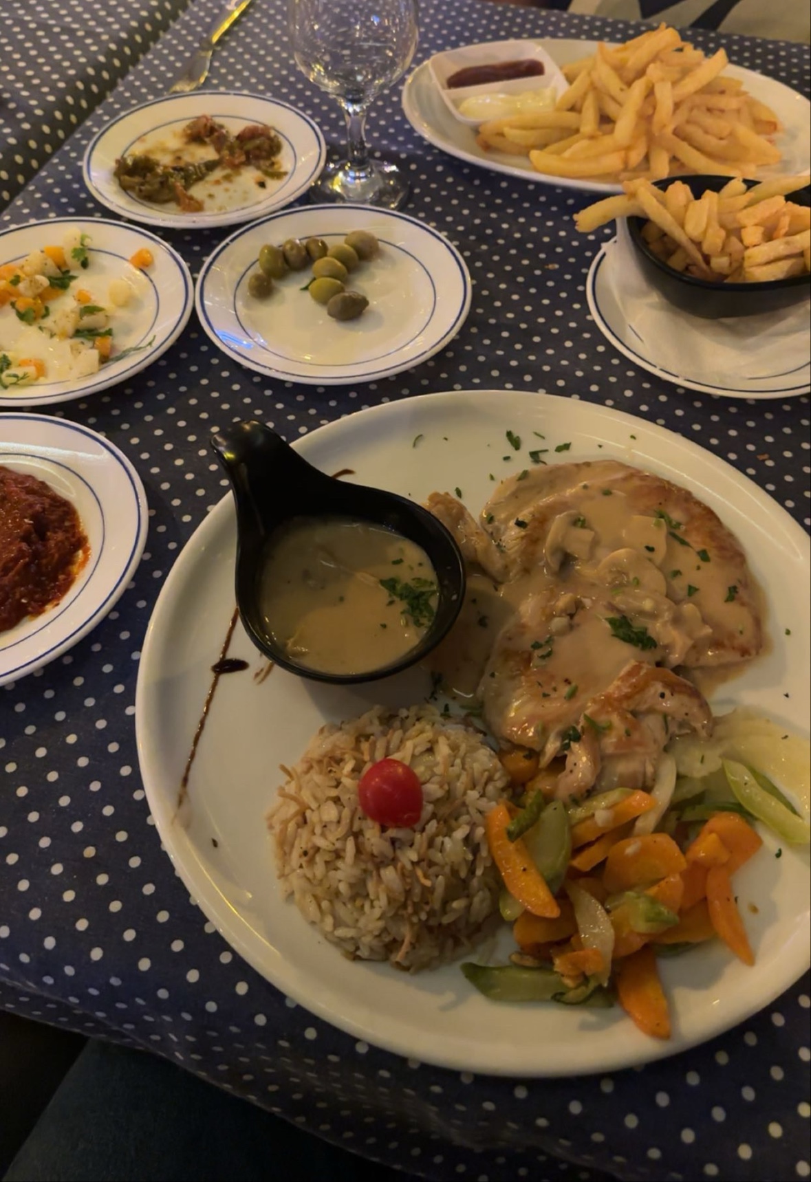 The restaurant is nice, spacious and clean. Before the main dish, they serve some complimentary appetisers which were tasty. The food (main dish) was not bad but nothing special, just ok. The fries were good, the only real crispy fries we have had so far in Tunisia. Main issue was the service : the waiters were many and were walking around to look at the plates, it was overdone to the point where it was uncomfortable. I was asked twice if I was done with my food while I was still eating, the second time the waiter even touched the plate. Moreover, I still had food in the small appetisers plates and they wanted to take it while I was still eating from them. Probably this is how the waiters are trained, so it is not their fault and they were nice as well. But the service was stressful and I felt rushed.