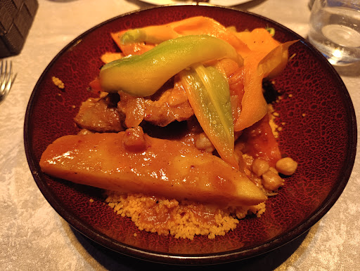 We went there as a group of more than 50 people with a set menu. The menu that was sent to us prior to the dinner included a regular and a vegetarian menu. The vegetarian menu was supposed to be veggie soup, veggie rolls and couscous + dessert. First thing vegetarian people got served a chicken soup. I asked five different waiters if there was chicken in it because you could taste and see it, but everyone kept saying no. Obviously we couldn't eat it. Then we had the couscous with vegetables, and half (?) dessert. No one brought us the rolls at any point. (The people who had a regular menu also had a few problems with their dishes.) In the end, they wanted us to pay 29 euros (even if the vegetarian menu we agreed to was 23) for one soup we couldn't eat, some rolls we didn't get and a plate of cous cous that was good but not 29 euros good. We stayed there for more than an hour to try and fix all the mess it was made, but in the end we still paid way more than that dinner was worth because they couldn't manage the mess they created and we were tired of negotiating. The food was good, but the overall experience felt like they weren't professional (I'm a waitress, you MUST know what you're serving people) and they were trying to scam us making us pay way more than their original prices. Maybe they treat locals differently, I don't know. They had all the potential to make it a great night, but it was so frustrating and so expensive for...