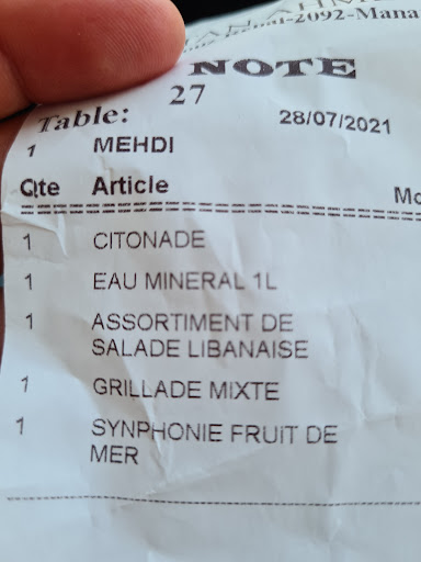 Read moreThe two stars are for the bad samosa, baba ghannouch, humus and Kebba. The samosa was made with dough not rolls and the filling is bland. The baba ghannouch was horrible, no acidity no tahini. The humus was disgusting, I ate a garbanzo paste, literally pure garbanzo, no tahini no acidity. And the worst one, the kebba. You can literally hurt someone with it. It was super hard and the filling lacked minced meat and it was bland. The service was scammy, we ordered one order of mixed kebab for 36 TND, and the dude brought mixed grill for 4 people that cost 130 TND. It was a scam, we were two persons and we ended up taking the rest to go. The kebab was decent! We left the appetizer as it was horrible. Bottom line, do not order the humus and the rest of the dips and appetizers. And beware of the server, ask him to repeat the order and make sure you point to the dish you want to order on the menu and...