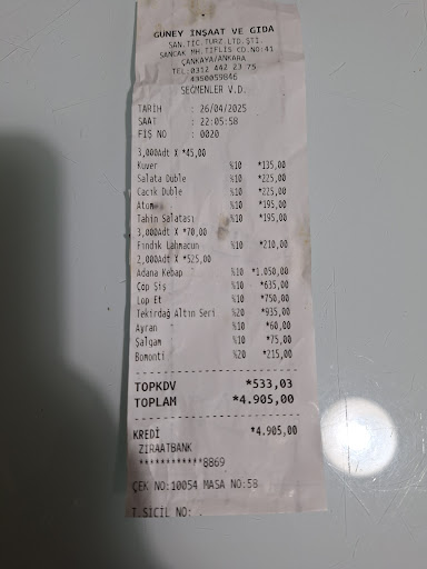30 Nisan Çarşamba akşamı 2 kişi gittik. Normalde alkol tüketiyoruz ama o akşam alkol almayacağımızı söylediğimizde garsonun yüz ifadesi bir anda değişti, açıkça memnuniyetsizliğini belli etti. Siparişimizde şalgam, 2 Adana ve 1 kaburga vardı. Bu arada soğan, 3 yoğurtlu meze, salata ve fındık lahmacun siz söylemeden masaya geliyor, klasik kebapçı usulü yani. Adanaları bitirdikten sonra karburga hâlâ gelmemişti. İki kere hatırlatmamıza rağmen getirilmedi, biz de artık doymuş olduğumuz için hesabı istedik. Tam o sırada, etsiz 3 parça kaburga getirildi. Ve tüm bu deneyimin sonunda 3750₺ hesap geldi. (Etsiz sunumsuz 3 parça kaburga 750₺)