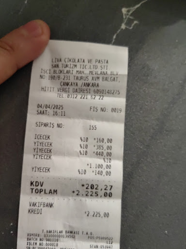 Read moreTaurus avm Liva pastanesinde ailece bayramda kahvalti yaptik ve cok begenmistik. Bugun ise tekrar kahvalti yapmaya gittik. Kahvaltida ise ilk bardak cay geldi. Ikinci bardak cayi istedigimde onumden 3 garson fakli zamam araliklariyla gecti. 3 kisiden de cay istedim 3 u de getirmedi. En son kalktim yanlarina gittim ve benim kajvaltim bitmek uzere cay yeri neresi ise kalkip kendim alayim dedim ve durumu izah ettim. Izah ettigim bahce sefi ise hic orali bile olmadi hatta yuzume bile bakmadi. Geliyor cayiniz siz yerinize gecin gelir dedi. Bende gectim ve tekrar kahvaltima devam ettim. Sonrasinda kahvaltim bitti ama cay hala yoktu. Ortam ise o kadar kalabalik bile degildi. Ben hesabimi odedim ve kalktik. Cikarken sube muduru ile gorusmek istedim ama sube muduru yoktu. Onun yerine ben sube mudur yardimcisiyim diyen bir beyfendiye tum olani anlattim. Ama acikcasi severek kahvalti yaptigimiz LÍVA pastanesine bu durum hic yakismadi. Bu yuzden kahvaltimiz burnumuzdan geldi. Kahvalti icin gidecekseniz bu yeri onermiyorum. Hizmet bu sekilde olunca yemegin guzelliginin bir kalitesi olmuyor...