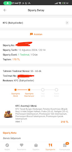 Read moreSaat 20.35 civari üç kisi sipariş verdik.Herkesin siparişi eksik geldi . Patatesler buz gibiydi.Tavuk sandevicler buz gibiydi ve sube evimize cok yakin.Yemek sepeti destek hattina 2.5 saat icinde üç kez yazdim fakat eksik siparisler yinede gelmedi .Saat 23.15 ve hala,eksik ürünleri getirmediler . Koskoca KFC ama sanki siradan ara sokakta özensiz hizmet veren küçük bir yer gibi .Tekrar kesinlikle sipariş vermem kimseyede...