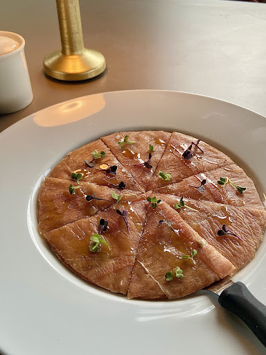 Gittiğim restoran otelin giriş katında Marmara Denizi’ne bakan bir konumda bulunuyor. Restoranın genelinde loş bir aydınlatma tercih edilmiş. Bu tercih, fotoğraf çektirmeyi zorlaştırması dışında huzurlu bir atmosfer yaratılmasına yardımcı olmuş. Dekor oldukça sade ve dingin bir atmosferi var. Şefin lokantalarında dekorasyonda ressam olan annesi tarafından yapılan sanat eserlerini kullanma geleneği var. Burada da bu geleneği bozmamış. Hem duvarlarda hem tabaklarda bunları görmek mümkün. Yemeklerin sunumları ise genel olarak sade ama şık diyebilirim. Menüye rafine tatlar hâkim. On çeşit yemek paylaşımlı şekilde sunuldu. Porsiyonlar küçük gibi görünse ve bu mutfak ekmek içermese de oldukça doyurucu bir menüydü. Yemekleri çubuklar aracılığıyla yedik. Restoranın açık alanında camekanlı sonsuz ateş ve küçük havuzların kombinasyonundan oluşan bir atmosferi vardı. Ton balığı ve mantarlı pizza ile tadıma başladık. Umami mayonez, miro biftek otu ve beyaz trüf yağı içeren hafif bir başlangıçtı. Ardından gelen somon tataki özellikle hoşuma giden lezzetlerdendi. Deniz mahsulü sevenler mutlaka denemeli. Tataki, et veya balık pişirmede kullanılan bir Japon mutfak tekniği. Yüksek ısıda kenarları mühürlenen etlerin içleri çiğ bırakılıyor. Ardından ahtapot crudo adlı yemeği tattık. Domates-soğan salsa, balık aromalı sirke ve zeytinyağı içeren ahtapot etiyle hazırlanmış bir yemekti. Doku olarak ceviche ye benzettim. Etin dokusu biraz daha elastikti sadece. Bu da hoşuma giden bir lezzet oldu. Kişniş otuyla...