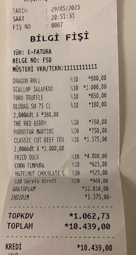 What an awful experience! Anywhere in the world we could eat in Michelin star restaurant and enjoy every single dish for less price then we paid here in Inari Etiler. Sushi rolls were not tasty, blend with bad texture and simply not good,we can eat in sushiCo better dragon roll than here, at least I can feel eel in there. Then the tenderloin came and it was blue/grey color, dry, chewy and salty …it was the worst dish we have ever tasted I wish I would take a picture of it but I was in shock I guess. We asked to take it back and thankfully they did. Then we tasted crispy duck , and again it was blend, dry and kind a chewy. The balance and quality of every dish is just not there .The cocktails were fine. Service: 2 waiters that came to help us , didn’t know anything about menu because they were new, the administrator women who was helping with seating, she came to us after we finished our main course and she asked us to sit in a bar area because the tables are for 2 hours( which they should tell us before). So we had to eat our dessert in a bar area. We are disappointed. We paid almost 11000 Tl ( for two people) for the experience that we...