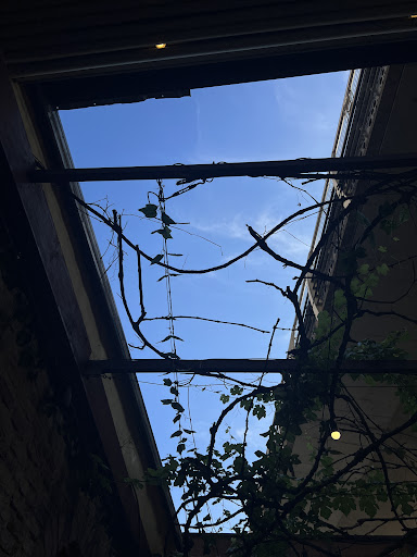 The enclosed courtyard area is quite lovely with the grapevine overhead, all the other plants, exposed brick wall, warm wood furniture and really soothing vocal smooth jazz standards playlist.