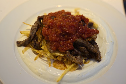 And the food? The cold mezes were good, the calamari (₺ 58) very fresh and tasty and the blue fish (₺ 90) was prepared excellent with still enough moist inside and not the greasy. However, why not give the salad any dressing? The veal stripes and shoestring potatoes served with yoghurt and tomato sauce (₺ 74) was good, but the shoestring potatoes were overbaked and served in a bath of humus. We ordered the same salad again (₺ 28), but it was completely different. We noticed the chaos had spread from the restaurant to the kitchen. Dessert was not impressive.