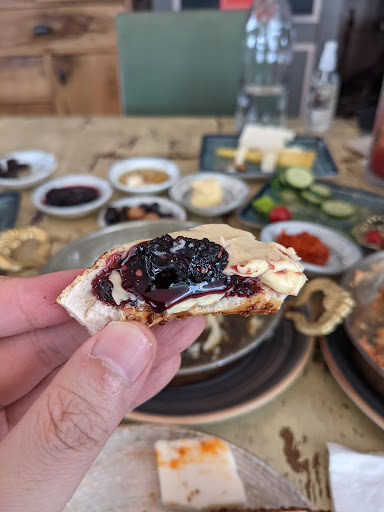 Turkish breakfast set: the simit (sesame ring bread) was very toasted on the outside so just a little tough, but deep flavor. Simit was great with the mulberry jam and honey with butter. From the cheese plate, the string cheese was milky and milk, like a low moisture mozzarella or colby jack. The white block is like a feta but may be cows milk, and more creamy than feta, but similarly salty and strong. The darkest wedge is like a gouda....