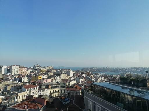 Great Space and View: They escorted us through a charming old school elevator to the third storey where the view was wonderful - street below, the city's homes on slanted ground and the ocean, along with the beautiful Istanbul coastal skyline. They had both outdoor space with heaters, and indoor with glass windows. It was not crowded (Thursday evening) and we had privacy. As the sun set, the view became even more beautiful at night, with the entire skyline lighting up. We moved indoors when it got too cold after dark.