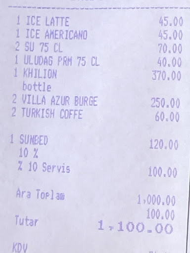 This incident marked the 4th time such an issue had occurred during my visits to Bodrum, and I must express my disappointment in the lack of transparency regarding billing practices. Despite this issue, I must acknowledge that the overall atmosphere and the quality of the food were satisfactory. It is worth noting that the beach is stony, so wearing beach shoes is recommended.