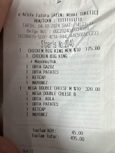 Read more2 Ocak 2019 tarihinde buradan üç adet big king menü aldık. 51 TL dediler verdik yani bedava almadık ama işletme para vermemizi rağmen bize üç adet bayat ekmekli hamburger ve iki adet şekerli su (hesapta kola) ve bir adet başka bir şekerli su (hesapta fanta) verdiler. Paket yaptırdığımız için tekrar şubeye gitmeye üşendim ve çöpe attım. Bu tip işletmeler hizmet kalitesinde genelde kötü oluyor ama uzun zamandır buradan yememistik ve bir anda aklımıza gelince gidip aldık. Kardeşim insanlar sana para ödüyor bir hizmet almak için ama siz bayat ekmek ve hiç gazı olmayan mesrubatlari insanlara utanmadan veriyorsunuz. Yıldız bile vermek istemedim buraya. Karar sizin arkadaşlar ama bu son oldu artık bu tip yerlere asla gitmem. Yazık bir sürü insan oraya para ödüyor ama karşılığında hiç bir şey yok. Denetleyen de yok tutturmuşlar bir yol gidiyorlar. Yurt dışında bunu yapmıyorlar ne vaadi ediyorsa onu veriyor adam ama ülkemizde sürekli kazanayim ama karşılığında bir şey vermeyeyim...