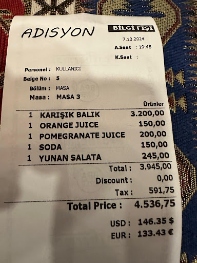 I gave $80 USD and was expecting change but the change was calculated using the Google rate I mentioned vs the Price was the fake USD RATE. A slap in the face. The manager, realizing I understood the discrepancy, awkwardly offered an extra 100 TRY as compensation, which was still less than what was fair. The situation felt embarrassing, like I was bargaining over food, especially as I wanted to tip the waitress for her good service. However, the manager dismissed the idea, likely aware I had already been overcharged.