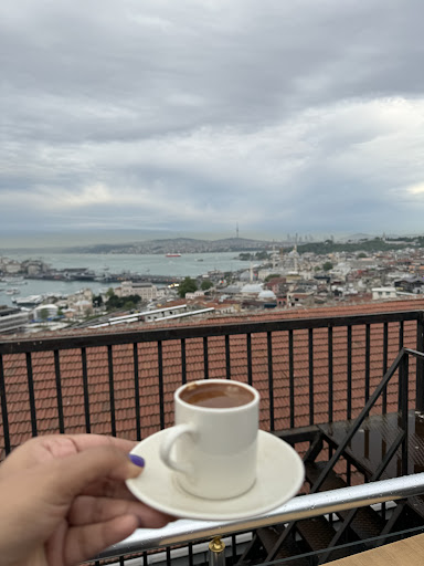 During my 5-day stay in Istanbul, I discovered the best view of the city from this café. It offers breathtaking views and excellent service. From here, you can see the Bosphorus River and Bridge, Hagia Sophia, Blue Mosque, Sulemaniye Mosque, Galata Tower, and all the other landmarks you can name. You can even see mosques and towers from the Asian side. The café is located right outside the exit of the Sulemaniye Mosque and has indoor and outdoor seating arrangements with two rooftops. When it suddenly started raining, they provided big shades outside too. They also have some cool artworks at the indoor area.
