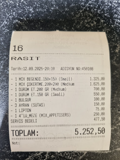 Read moreThe menu is full of traps, we ordered small portions of mixed meat 100 grams in our wrap but was charged double. Nowhere does it say on the menu that for a mixed option (which would be 100 grams in total 50-50) you would be charged for the meats separately, since it was recommended by the guy serving us, he should’ve warned us about it, but he didn’t. We also clearly said that we are ordering 100 grams which is a small portion when ordering. They also tried to charge us for 4 lentil soups when we only had 2. If you do decide to eat here make sure you are aware of their carefully crafted menu to deceive you and look at the bill before paying it. Also the service fee was around 15-20% which is ridiculous for a bufe on the street. While eating the guys were keep touching our table as well, taking our salt away for another table which was very annoying. When we argued the bill they became loud and didn’t want to hear anything we said, kept saying the same thing so we decided to pay to avoid causing a scene and ruin our day. Ended up leaving with 550 liras less in our pocket which is quite a joke, since we spent much less in other places for much better quality and service. Will never return here. And the food wasn’t even great for all...