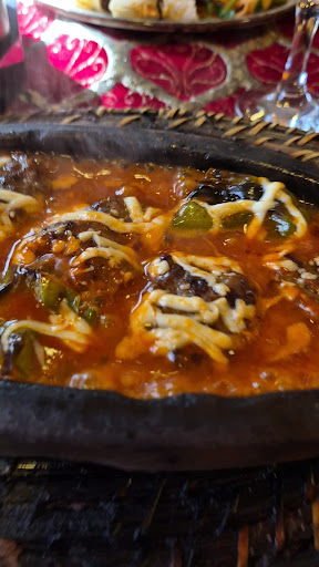 At first we all thought this restaurant is just the same as the others in the area, with the same menu and some overselling. However, now we've been and I would recommend this place. The music they play, although on TV, is a tasteful choice of some traditional Turkish strings. We've got starters for free, as an incentive to come in and give this place a try. Humus, some spicey paste (best) and satsiki (?). It was a good combination with bread, Portions were small, but enough to try and it was free. We then ordered Turkish ravioli (more like pelmeni, only made into smaller size pieces). And some some kind of meat and vegs piping hot on a thick stone dish satisfying with warm bread. Pomgranate juice is something we always order and were not disappointed here. Then we ordered traditional turkish tea, but a very young waitor (14 year old I'd say) talked us into trying pink pomgranate tea. I was skeptical as looked like hibicus to me, but it turned out a very good recommendation. I didn't quite understand about that tea though, I think that might have been a promotion from a nearby shop. Baklava was nice, baked through but succulent and not tasting as raw flour.