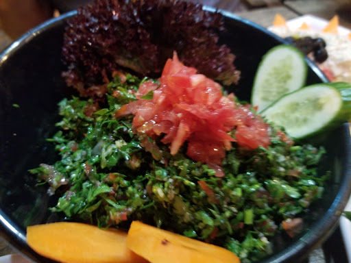 Read moreI have stumbled upon this hidden middle Eastern/ western restaurant. Popular with breakefast, brunches and tons of choices under one roof; ranging from breakfast, pizza, pitas bread to delicious fresh home-made middle eastern salads; fatoush, tebuleh, babaganouj, humus and mouth watering endless crispy sandwiches to choose from. I was impressed by their quick response and keen service. Also on a side Slab of wooden tables outdoor. To top it off, sounds of love birds "budgie birds" ! I would recommend this place reasonably priced and if you are wanting to samples a variety of small dishes...