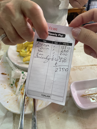 Bloody scam, obviously ripping off tourists. A single wrap costs 490 liras, and a two person portion of doner kebab + fries costs 1250 liras - we ordered it expecting an honest portion of meat but the amount didn't justify the price at all. We ordered just tea, but they served us with baklava which we didn't asked for (we rejected but they said no it came with it) and whacked us 200 liras per tea "set".