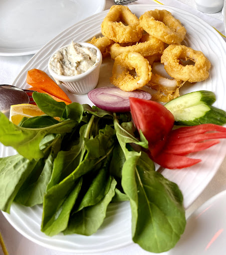 Handmade lamps & colorful decor in an intimate restaurant specializing in fish & seafood dishes.