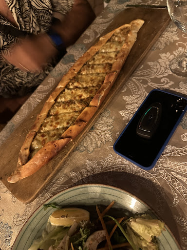 The restaurant was busy when we arrived at 8pm on a Saturday night but we were welcomed warmly and seated immediately. Everything worked like clockwork in the beginning; our drinks arrived promptly, the complimentary balloon bread and dip, my starter of grilled halloumi (delicious). Husband's prawn cocktail order was misunderstood and fries with cheese came instead..they corrected this promptly and were apologetic. Our main courses of Adana Kebap (a little disappointed as it was warm not hot) and Salmon steak (fine). Trying to get a second drink proved difficult. The first waiter forgot to put the order in and the second waiter, though apologising profusely didn't rush to get it either. Waiting to get a bill took even longer and there had been no offer of dessert which in any case at this stage we didn't want as it might take another hour. In their defense, it was very busy and they were trying their best..it just put a negative light on what we wanted to be a...