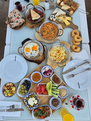 Frequented by locals and tourists alike, this particular venue is located in a promontory at the end of Chaliş beach with stunning views of the surrounding mountains, Fethiye harbour and Chaliş beach as it stretches away into the distance. Taking a seat outside, you can enjoy your drinks/meals while watching a magnificent sunset and the wonderful hues of the sky as the transition from daylight to twilight to night takes place. This truly magical experience is enhanced by the friendliness and attentivness of the staff, excellent quality food which is presented magnificently. A real, high quality, dining experience which is further enhanced on arrival of the bill. Obviously, what you pay will depend in what you order but, in our case one starter, two meals, one desert, two G&Ts, one Effes and two sprite came to less than 2500.