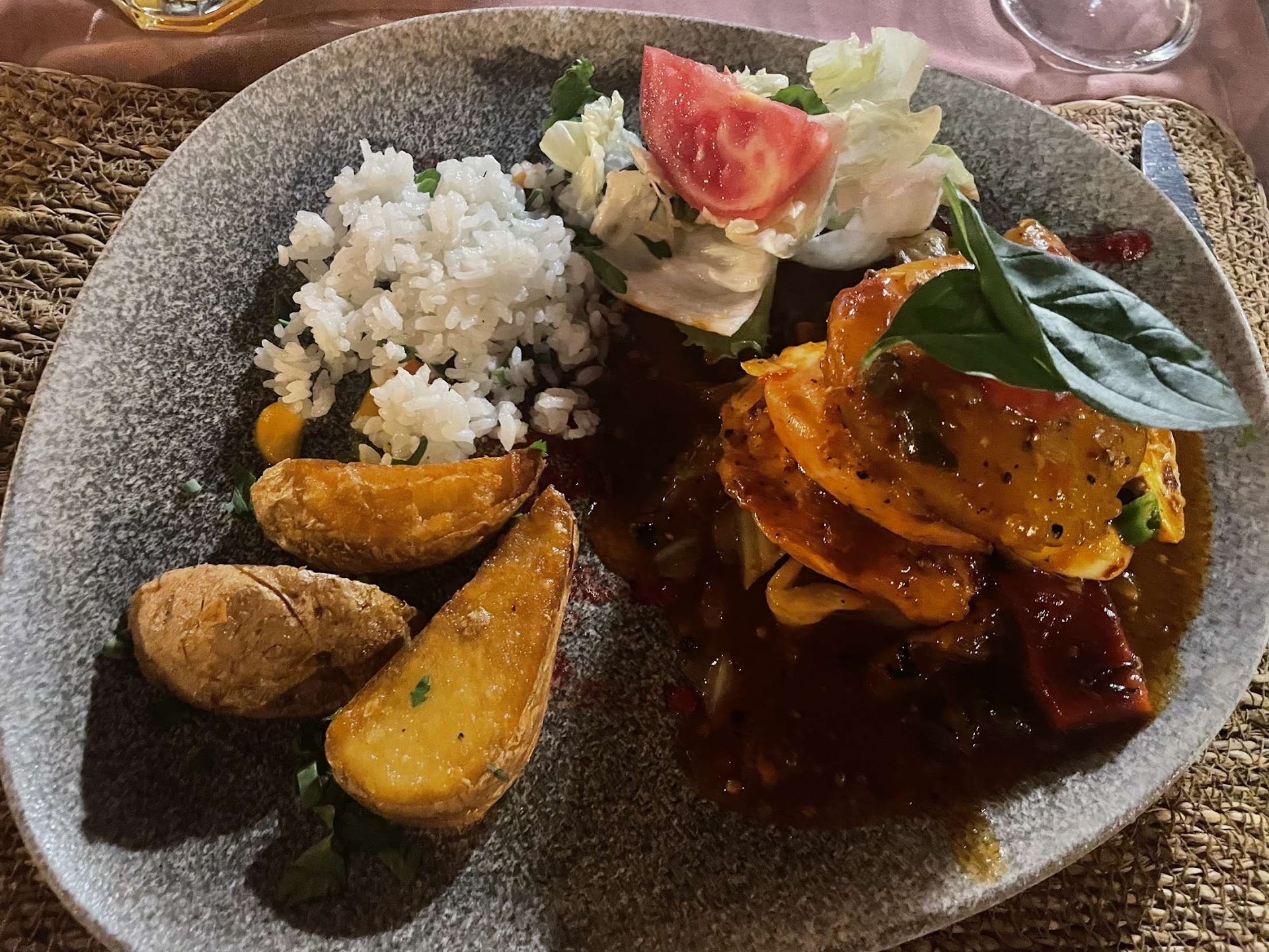 Couples meal, the food in this restaurant is a good standard. A slightly fusion style so each dish had has the restaurants own take on it. Bread and balsamic/olive oil dip were put on the table which we shared whilst browsing the menu. Starters were prawns, five large ones in tempura batter and Karizma special parcels in filo pastry. Prawns were well cooked and batter good, meat parcels, two small ones with a couple of bits of salad were mainly cheese. They were cooked well, and shared the same dips as the prawns. Mains, Steak Rossini rare, came as ordered. Very notable was the tenderness of this steak, top work by the kitchen. Liver, cooked just right and in a bed of peppers and rice on the side, the flavours of this dish had a slight mexican influence. We looked through the wine list and struggled a bit because the types of wine were familiar but brands no so, we asked to try one but it wasn't in stock. Settled on a house red which turned out to be a good safe option. Deserts, Eaton mess, cream, meringue, tiny piece of strawberry and a glaze run over the top. Coffee, the first restaurant that we'd found after a few weeks in Turkey who served liquor coffees with real cream, that was a very nice apres meal touch. Definitely worth a visit, compared with other prices locally this is expensive, but comparing same food with the UK it is...