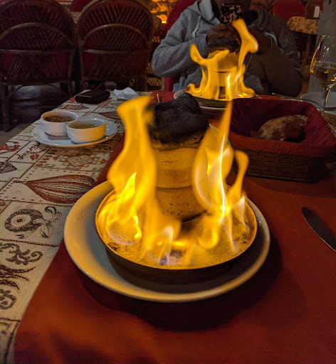 The menu offers a large selection of choices. As ‘pescetarians’ we also had plenty of choices. We selected the Sebzeli Testi (pottery kebab with vegetables) and a grilled Levrek fish. Prior to our entrees being served, we were presented with a delicious loaf of bread, fresh from their special oven, which was paired with dipping dishes of marvelous za'atar spice and quality olive oil. We could have left happy, just from that portion of our meal, alone! The vegetables in pottery arrived in the form of a theatrical performance: delivered in a blaze of flames, and ceremonially opened by our expert server, it was a wow-worthy experience. We were expecting a fairly simple mix of roasted vegetables, but the light sauce they’d included was out of this world: so yummy! The whole fish arrived perfectly roasted: skin was crispy and bubbled, the interior flesh plump and juicy.
