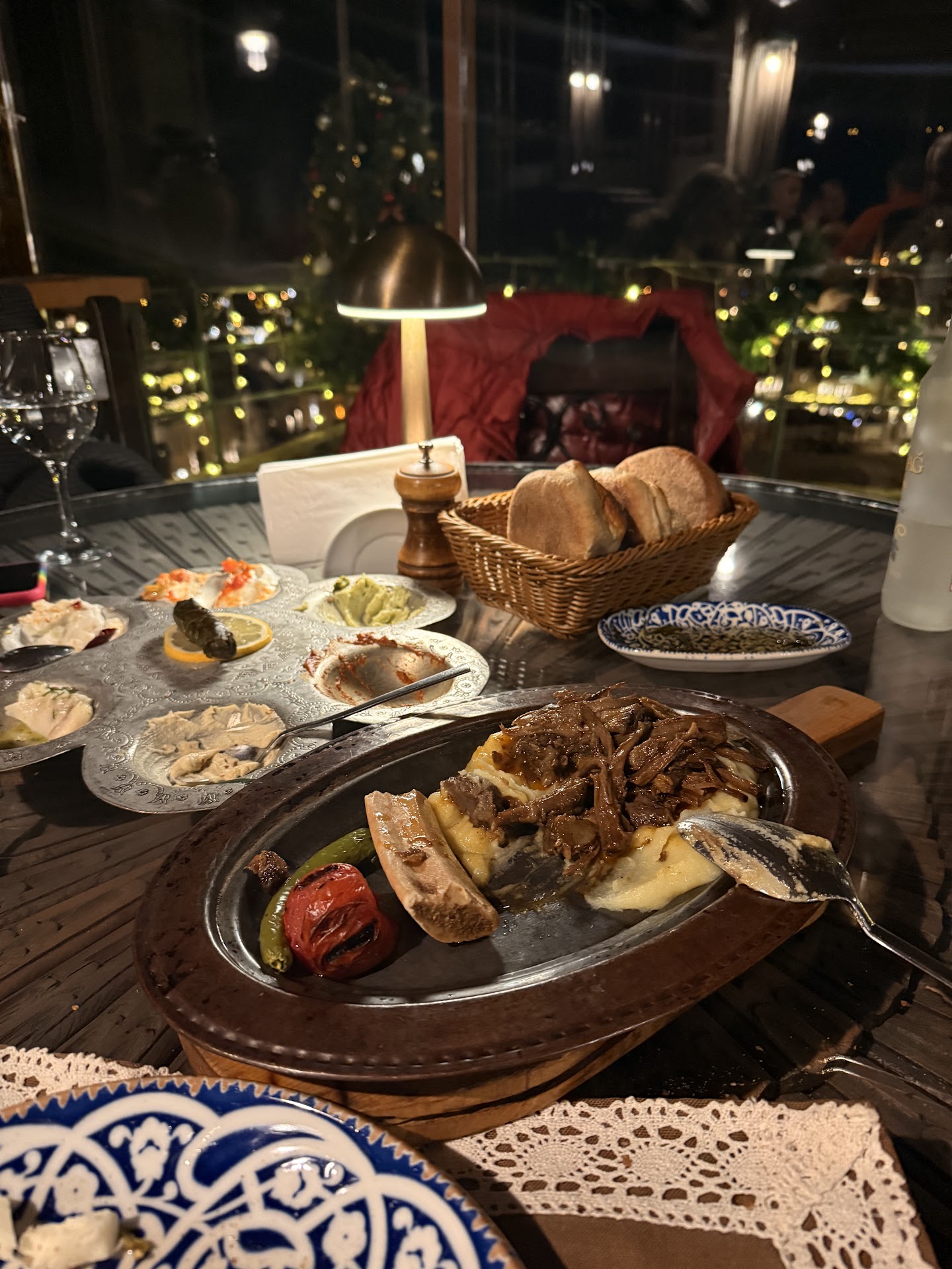 Soft lighting from hanging lamps cast a warm glow across the tables, while intricate details in the decor added to the overall charm. The panoramic view of Cappadocia’s fairy chimneys and festive decorations made the setting feel intimate and magical, a perfect backdrop for an unforgettable evening.