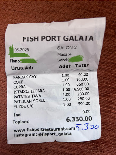 the restaurant was chosen randomly After viewing the restaurants closest to the hotel, the choice fell on the nearest restaurants located on the Galata Bridge. So, Fish Port itself: before visiting, I checked with Google: 4.8 is an application âfor reaching the semi-finalsâ, which I wanted to check right away. We visited the restaurant around 18:00. In reality, I would have passed it by (even knowing the rating) if the venerable gentleman had not stopped me. His clothes were different from the uniforms of the workers, who generally did not care about passing potential "purses". This gentleman suggested the possibility of a wider menu, in isolation from the standard. Barkers - nothing. If not for him, I would have passed by, regardless of the rating. In the end, with his help, instead of the standard menu of sardines and squid in batter, we settled on Lobster, king prawns and grilled sea bass. What can I say - the lobster and shrimp were excellent. Served with vegetables that go well with the main course. Seabass was taken on the grill. Here you need to clearly understand what you want to get in the end: our grilled fish was dried. Now, analyzing, I would take it in salt. The accompaniment of the protein presence was an excellent green salad. As for the kitchen, no complaints. Service - a Russian-speaking girl was assigned to us. For me, this is more a minus than a plus - I speak English fluently. But these employees usually imagine themselves as shepherds among the sheep. Carrying nonsense about the complexities and hardships of their lives. Allowing yourself to leave the table, and allow the guest to pour the wine himself (I remind you that in this restaurant, 10% of the service fee is automatically included in the bill). Despite the seemingly fixed waiter, it was she who I saw less than I wanted - different people took part in our dinner. The aforementioned gentleman generally controlled the process, but he poured in details from the weak work of the Chaldeans. In gratitude from our orders, we received a sweet dessert and a fruit plate. When calculating, bingo! - I was told that the service fee does not cover the work of the waiter and downcast eyes, I was asked to think about additional compensation. This fact has become for me beyond good and evil. Recommended to discuss the issue of compensation with the owner. Bottom line: good food, fresh food, good views, and service that spoils the...