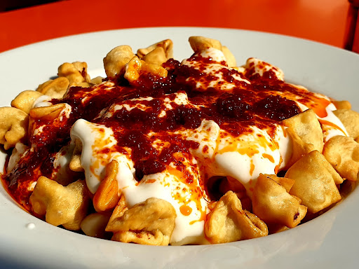 Manti (dumplings) and vareniki (ravioli) that are small and filling, the sauce is inside and aplenty. Maybe you could start putting it on the side, it would be so much better than to scrape it off to the side trying to find food underneath the sea of semi-spicy very oily stuff floating in yogurt. Not sure if factory-made or handmade, looks the same to me, and it’s pretty expensive, if premade. Overall tasty, and the abundance of dough and oil are filling, of course, would recommend if you need a quick carb/fats fix and pizza/pasta/rice won’t do it for you. Not much stuffing can be tasted beyond that amount of sauce. Nothing special at all, don’t get the rave reviews, literally the same thing taste wise that you can buy in the frozen food section and top it with the same supermarket yogurt. Their salad is good, but it’s literally just cut up tomatoes/cucumbers/peppers, didn’t have any special sauce over it (but maybe that’s better, considering their treatment...