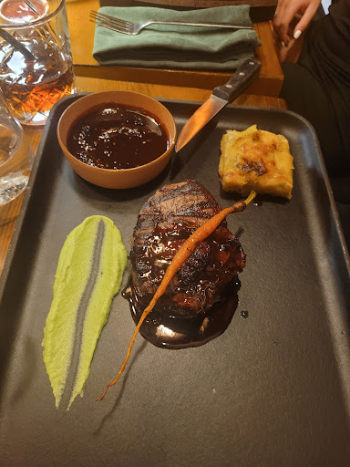 Мы пробовали: • Утку в вишнёвом соусе на подушке из поленты — нежнейшее мясо с благородной кислинкой и идеально приготовленной кашей. • Кузу перзола в фисташках — нежнейшая баранина на косточке, обжаренная до идеальной текстуры, с тонкой фисташковой корочкой — восторг! • Салат с авокадо и салат с инжиром и сыром — два лёгких, насыщенных вкуса. Гармония ингредиентов в каждом кусочке. • Карпаччо из телятины — свежайшее, тонко нарезанное, тающее во рту. • Два стейка: • один — с хрустящим жареным луком и насыщенным соусом демигляс, • второй — с соусом из шелковицы. Это был космос! Даже те, кто обычно не любит сладкое с мясом — влюбятся. Этот фруктовый акцент подчёркивает вкус мяса и создаёт настоящую симфонию.