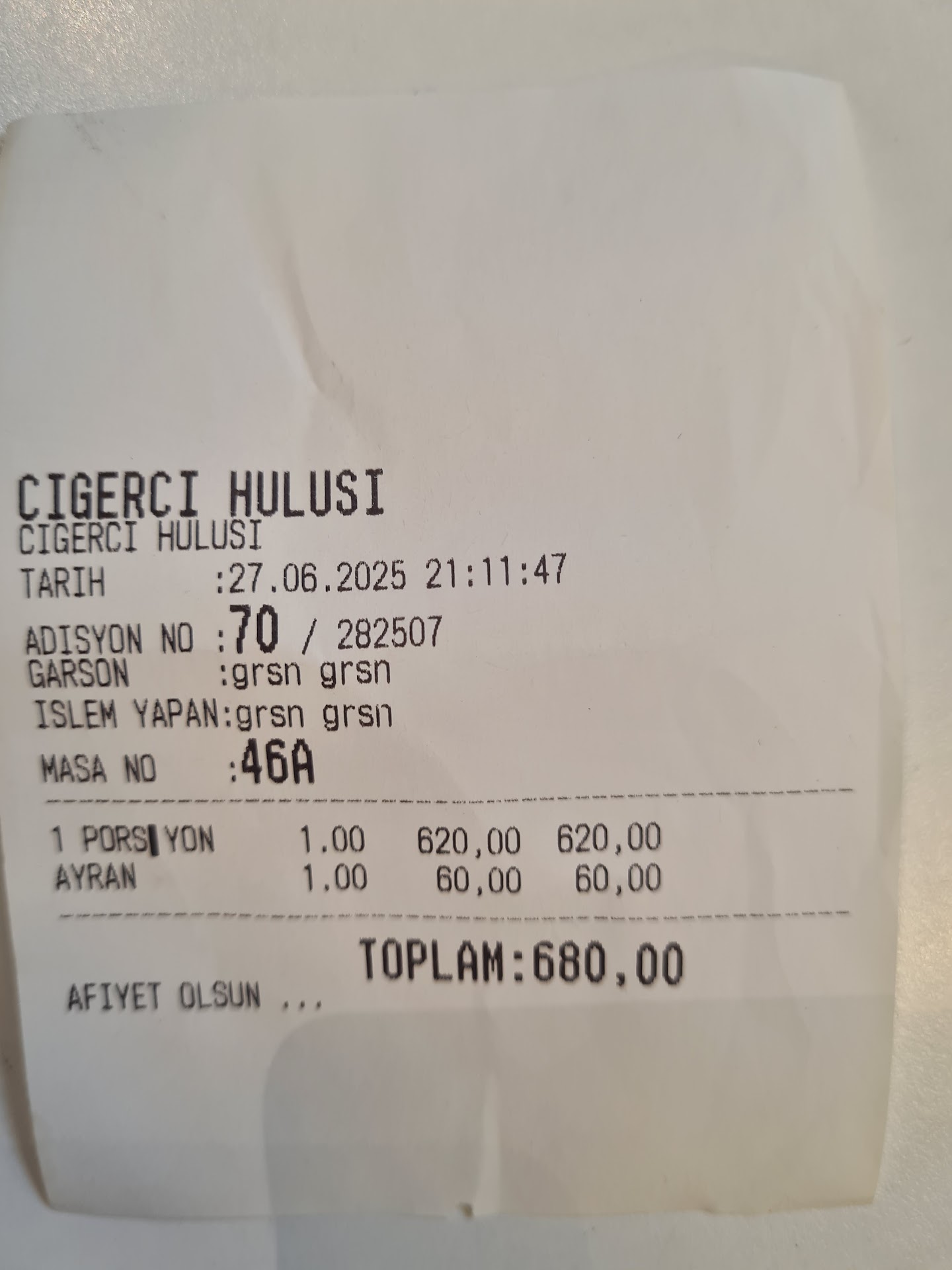Read moreDOLANDIRILMAK İSTEMİYORSANIZ GİTMEYİN. Arkadaşlar bu işletmenin sahibinin oğlu beni alenen dolandırdı ve ciğerci hulusideki yetkili dahil şubedeki hiç kimse yardımcı olmadı. Cigerci hulusinin yan tarafında bulunan mekanda akrabalarımla bişeyler içiyordum ve bu arkadaş oranın çalışanı olmamasına rağmen benden sipariş aldı ve aldığım ürünün 2 katı parada olan içeceği bana getirdi. Bende tabiki bundan habersiz olarak içtim söylemiş olduğum ücretteki içeceği getirdiğini sanıp. 1 saat oturup hesabı istediğimde ise 160 liralık hesabım 300₺ olarak geldi. Hesabı alan arkadaş ise benden sipariş alan kişinin yandaki ciğercide çalıştığını işi bilmeden benden sipariş aldığını söyledi ve 300 lirayı benden almak zorunda olduğunu söyledi. Hesabı ödedim ve benden zorla koparmış olduğu 140 lirayı almak için ciğerci hulusiye gidip benden sipariş alan çocuğun yanına gittim. Ve resmen beni dinlemeden koşarak ara sokağa gitti. Bildiğiniz koşarak uzaklaştı :D Ciğerci hulusinin yetkilisiyle konuştum bekleyin yardımcı olacağız dedi ve beni 20 dk boş boş bekletti. Mekanın sahibinin oğlunu arayıp çağırmasını söyledim konuşmak için ve kesinlikle umursamadı hatta yüzsüz şekilde polis çağırın o zaman derdinizi çözsün dedi :D babasını arayın onla konuşalım dedik ama polisle çözmemizi istedi ki benim canıms minnet. açtığınız o şubelerin parasını nerden buluyorsunuz açıkça ortada zaten. Ama polise de gittim merak ediyosa o arkadaş cimere de şikayette bulundum kanıtlarım ve şahitlerimle. Elinizin kiri 140 lira için rezil olduğunuzla kalacaksınız. Mekanda otururken hatta kuzenime buraya da gelelim bi gün ciğer yeriz demiştim ama sizin bu iğrenç işletmenizden haram lokma sokmam boğazıma. İyi niyet nedir bilmezsiniz. Rezilsiniz. Kesinlikle kimseye tavsiye etmiyorum ve hakkımı alana kadarda peşini...