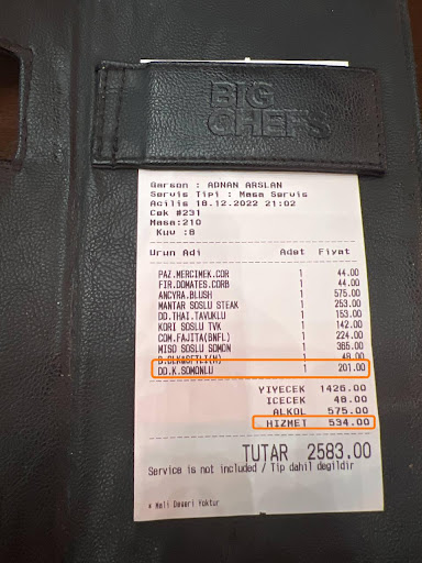 While we were pleased with food and service, overall experience was spoiled completely when I was rechecking the bill, sadly it was after we've already payed and left the restaurant. We didn't order "DD. K. SOMONLU" and we didn't see it on our table, but it is included in the bill, it costs 201 tl. Also we didn't ask for any additional service(line "HIZMET" in the bill) and we were not informed in advance that we would need to pay it, but it was included in the bill, it costs 534 tl.