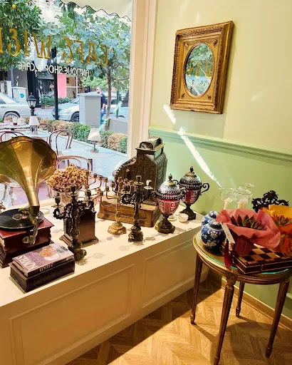 mekanı çok yerde görüp nasıl dizayn ettiklerini canlı canlı görmek istedim. şehir dışından gelen arkadaşımı ağırlamıştım. öğle vakti ve hafta sonu olduğundan diye sanırım hem içerisi hem de dışarısı oldukça doluydu ve yer bulmakta zorlandık. şansımıza bir masa boşaldı ve oraya geçtik, duble türk kahvesi, duble espresso, salep ve menünün üst kısmındaki ilk tatlıyı söyledik. kahveler oldukça başarılıydı çikolata ile servis edilmişlerdi, salep de üstünde tarçın ile servis edildi. tatlı ise bambaşka bir seviyeydi sıradan kafelerde karşılaşılabilcek türden değildi. üstündeki kreması, iç kreması ve karamel sosu hem hafif hem de inanılmaz lezzetliydi. hamuru da dışı çıtır ve içi yumuşak özenle pişirilmişti ve çok tazeydi. içecek fiyatları genel olarak pahalı ancak arada bir gitmek için verilebilecek bir para. genel anlamda güzel bir deneyimdi, antika eşyaları izleyerek sohbet etmek de...