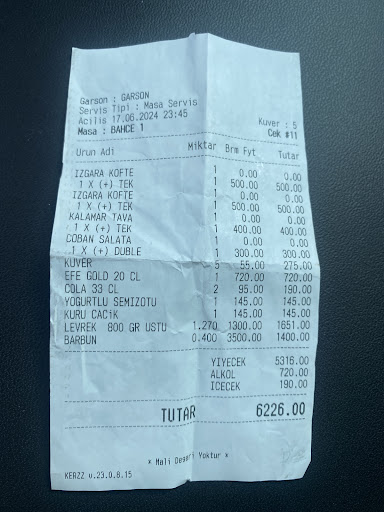 French chanson does not make a 5-star restaurant, even if the ambience is promising, the restaurant is far from it. Of course, it's also not an advantage if you know how to put staff in front of customers... Of course, I also expect Turkish influences on the Turkish coast, especially musically...but that's just a side note. The service was friendly and courteous. The food was good, especially the bread, it is advisable to order a dip or paste with it. The interception of potential customers can definitely be improved, there is definitely potential, but it can be improved. After all, there are plenty of restaurants on the street that just want your money, but also have a corresponding offer, but the main course (octupus - see photo) was damn tasty and deserves 10 points, although you can award 5. English is spoken here. All in all, the service was adequate and satisfactory. So for optimization there are possibilities, like gastropiraten ( unpaid advertising) just to exploit the potential especially because of the really fantastic main course. I can definitely recommend this restaurant if you like French chanson. Just a little note, there is a 200 lira service charge. I paid 2000 lira for an appetizer and a very very good and tasty main course and two beers. The price is of course reasonable for the facilities and...