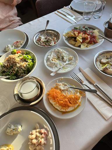 Fotoda yer alan mezeler (kabak çiçeği dolması, fava, patlıcan ezme, antibiyotik...) hepsi inanılmaz lezzetli mezelerdi. Sunumları çok çok şık ve elleri çok bol. Mezelere gezdirilen zeytinyağı epey boldu. Yancı olarak roka salatası ve gavurdağı salata istedik. Çok başarılıydı. Rakı çok güzel tombul çay bardaklarında servis ediliyor. Servis personelinin gözleri hep üzerinizde. Bardak bittiği gibi hemen yenileniyor.