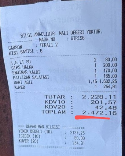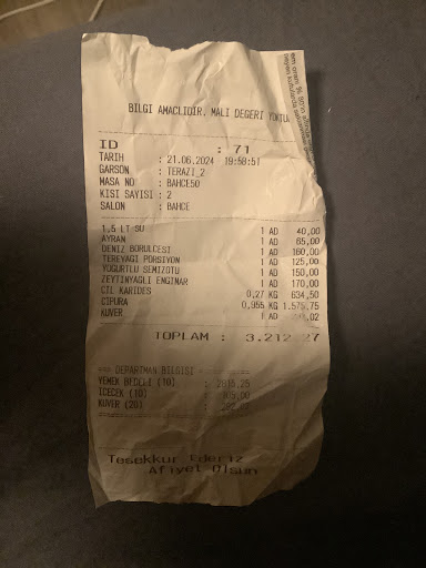 Almost feels like we got a tailored receipt based on the massive mark up they made for common nearby retail fish prices and that the waiter was very hesitant to share the product receipt after i had paid. 😳 For example they charged us 1575tl/48€ a kilo for local sea bream (Cupra) which goes for 279tl/8€ at other fish retail markets in Antalya. That’s five times more here supposedly. And then they charged 2400tl/68€ for speckled shrimp (cil karides) which goes for between 500-1000tl/14€-28€ at other Antalya retail fish markets. Service didn’t bring butter with the bread, which is good I guess when you pay 295tl/10€ (kuvar) for waiter service but then asking for it and them not mentioning they’ll charge 160tl/5€ for a small piece is quite disappointing behavior. Service members were fast and attentive and service minded though but given this pricing and not mentioning hidden charges like the butter and also water and the overall heavy mark ups only in the aftermath (note to self: ALWAYS ask kilo price before especially when they had zero price labels) they get one star for omitting pretty considerate information to share. Quite surprised the place has 2000 mostly positive reviews given the experience and the lack of price transparency upfront and leaving it to the end of the bill. Only the side dishes appetizers felt...