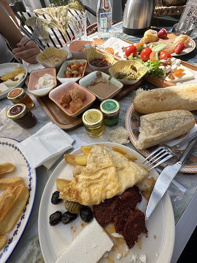 Mini kavanozlarda sunulan bal 🍯, incir reçeli 🍈, turunç reçeli 🍊 ve çikolata 🍫 enfesti! Tatlı fıstık ezmesi 🥜, kaymak 🧈, zeytin 🫒 ve fıstıklı kremalı tatlılar tabakta şölene dönüştü 🍽️ Peynir tabağı 🧀, sıcak tabakta ise nefis sucuklu kızarmış yumurta 🍳, çıtır pişi ve çeşitli kızartmalar 🍟 vardı. Üstelik sınırsız çay ☕️ servisiyle keyfimize keyif kattılar.