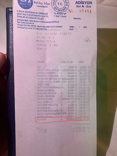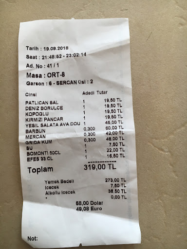 Read moreThere does not seem to be many reviews from the UK tourists so I thought it worth submitting this. It’s a nice restaurant in most ways and we were met by a young lady that showed us the fish displayed on ice and then accompanied to our table. We enjoyed a whole grilled Sea Bass between us accompanied by a selection of salads. The waitress suggested a bottle of local white wine which was excellent quality. However, we ordered two further glasses and needed plenty of ice as it was nowhere near the same standard. Now the downside, the bill when converted to euro came to €149, which for one fish shared between two plus mixed salads, one bottle of wine plus the two glasses is frankly obscene. Needless to say we won’t return to the restaurant and if Antalya tourist industry insist on generally overcharging then tourists will not be hurrying back. I pay less than this when im at my home...