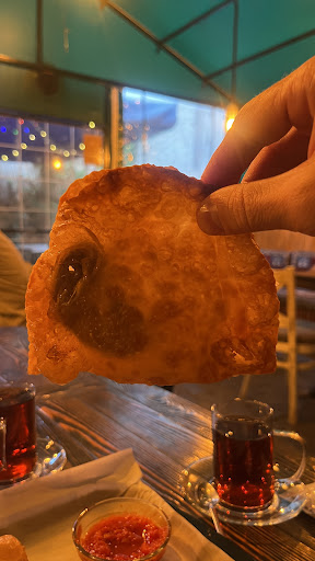 🤌Çibörek çok iyi kızarmıştı, epey sıcak servis edildi, içindeki kıyma çok lezzetliydi ve suluydu. Böreği dik tutunca kıyma tek bir tarafta toplanabiliyor o nedenle yerken tepsiye paralel tutarak, kıymasını eşit dağıtarak yemeye çalışın. 🌶Yanındaki biberler de çocuklar için fazla acı olabiliyor dikkatli tüketin.