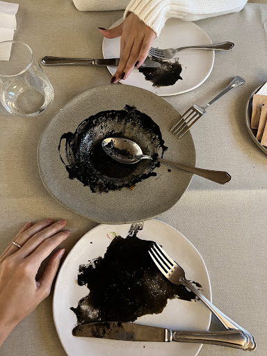 My wife and I reserved at the Red Balloon for her birthday. We arrived and were quickly greeted by staff waiting on the building's stoop. They led us in, allowed us to pick our table, and hung our coats. We chose the window seat because my wife and I wanted to appreciate the ambience of the dining room. A mid-light room set in brick, black finishes, and cut with a smart contrast of marble in the barista's area. It was intelligently lit so the lights bounced off walls and created a very cosy atmosphere. Comfortable. I felt like I was sitting in someone's home.