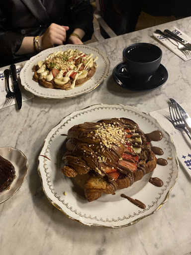 Bu mekanı güzel yapan tek özellik Yeniköyde bir köşkte olması. Sıcak içecekleri getirdekleri fincan içeceği o kadar kısa süre içinde buz gibi yapıyorki iki üç dakika içinde tüketmeniz lazım soğumaması için. Eğer şanslı gününüzde iseniz cam bardakta çay veriyorlar genel olarak sorduğunuzda cam bardak olmadığını fincan verebileceklerini söylüyorlar ( Biz bugün şanslı günümüzdeydik kaç kere sormamıza rağmen bugün ilk defa cam bardakta çay içebildik). Tatlı fiyatları porsiyonlarına göre çok fazla yüksek. Hanımefendi bir garson, sağ olsun başımızdan o kadar ayrılmadı o kadar çok bizi dinledi ve gözünü bizden o kadar ayırmadı ki onun da fikrine başvuracaktık konuştuğumuz konular hakkında. Fondüyü, waffleyi tavsiye etmem. Sıcak çikolata ve velvet fena değildi tavsiye edebilirim . Bir daha gitmeyi düşünmediğim bu mekanda atmosfer çok güzeldi fakat hizmet...